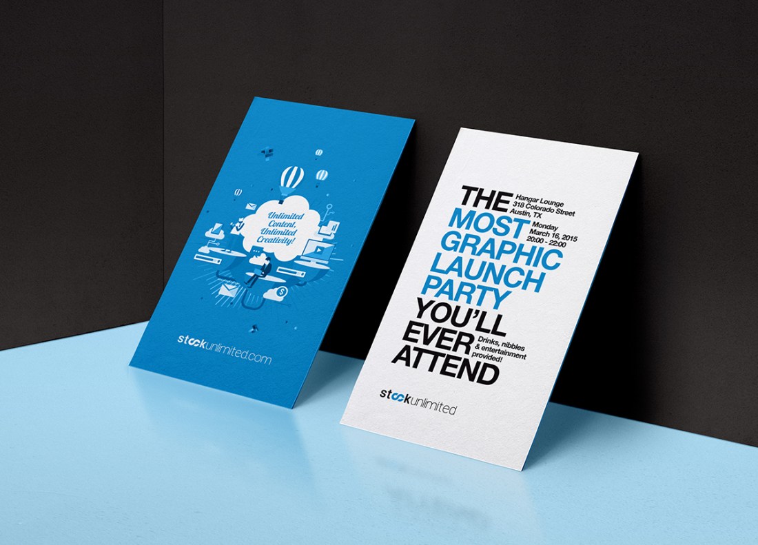 Invitation card design for StockUnlimited’s launch event, created to reflect the brand’s identity and generate excitement around the occasion through clean, engaging visuals.